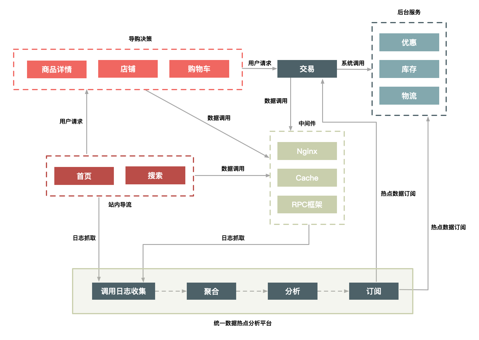 针对动态热点商品,我们需要构建一个可以自动发现热点商品的系统,大致思路是在上游中间件中(如Nginx)对热点数据进行统计(如Url),然后通知下游服务提前做好应对(如提前进行缓存)。