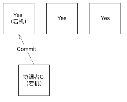 在进入阶段二后,在协调者C向第一个参与者发出Commit请求后宕机了,而唯一接受到Commit请求的参与者也发生了宕机。