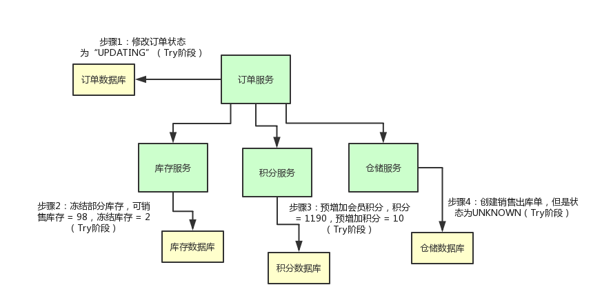 首先在TCC的Try阶段,我们不能直接执行业务逻辑,而是要把业务中所需要的资源预留出来并做记录,比如不能直接把订单状态设为已支付,而是设为正在更新;库存服务预留出订单中商品的数量,比如数据库中有一列称为冻结库存;积分服务也不能直接加到用户账号中,也可以在数据库中增加一列预增加积分;仓储服务也类似,可以把出库单状态设置为未知。