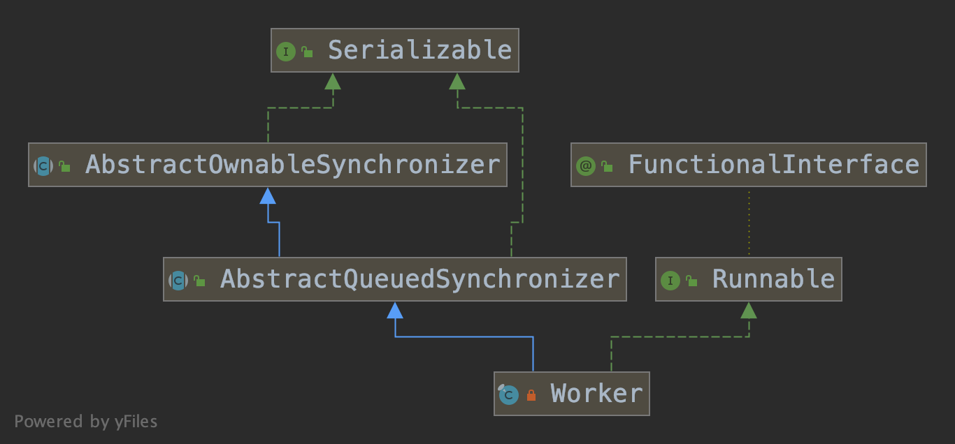 的内部类,是对工作线程的抽象,它继承自AbstractQueuedSynchronizer