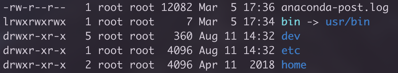 ,如果某一个权限缺失,那么在对应的位置上用-表示。三组权限中的第一组代表文件拥有者的权限,第二组是文件所属群组的权限,第三组是其它权限。