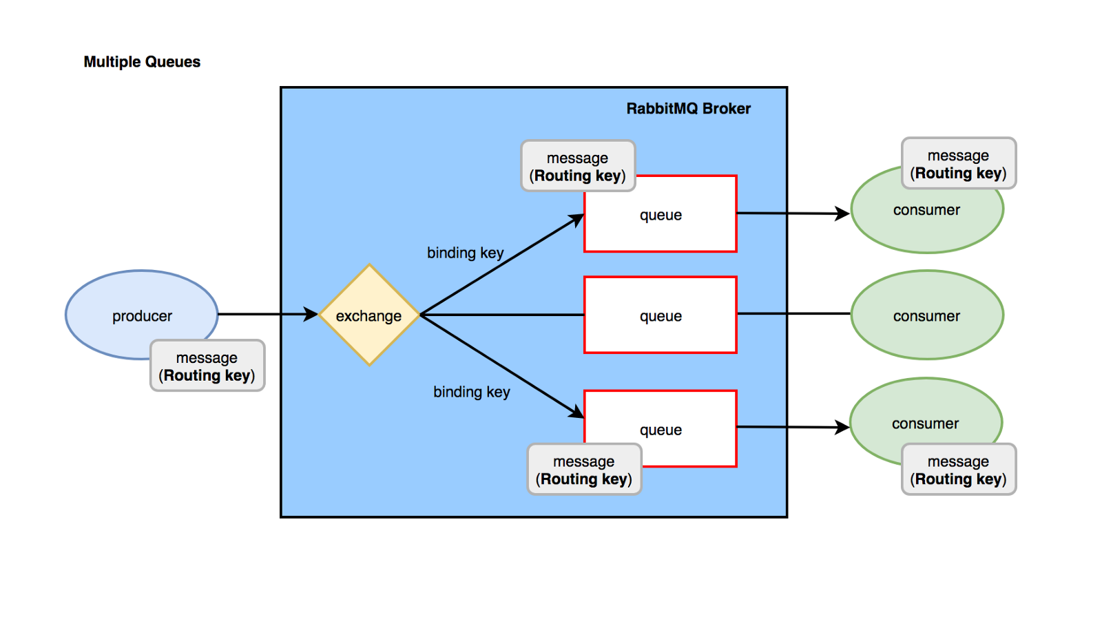 通常,在创建队列时我们会通过Binding操作把队列和一个或多个Exchange进行绑定,并为每个绑定关系设置一个Binding Key,当生产者向Exchange发送消息时会指定一个Routing Key,最后,Exchange根据Routing Key和Binding Key按照一定的规则把消息投递到一个或多个队列中。